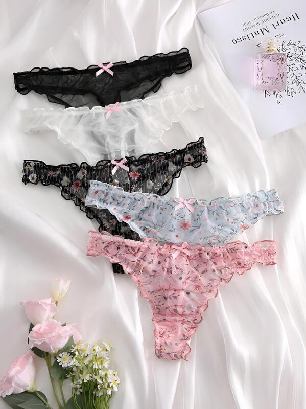 Pantie semi hilo de tela transparente con delicados volanes al costado y con pequeño detalle de lacito enfrente.